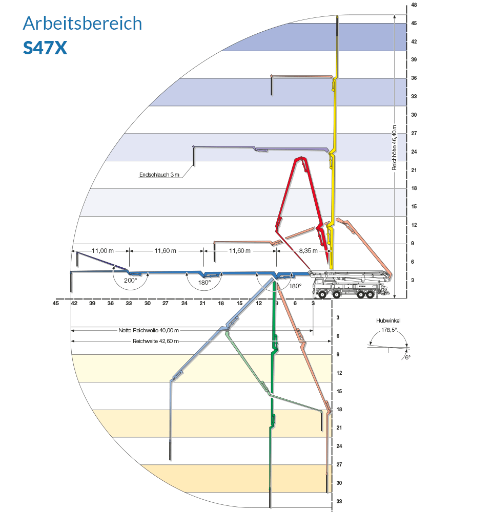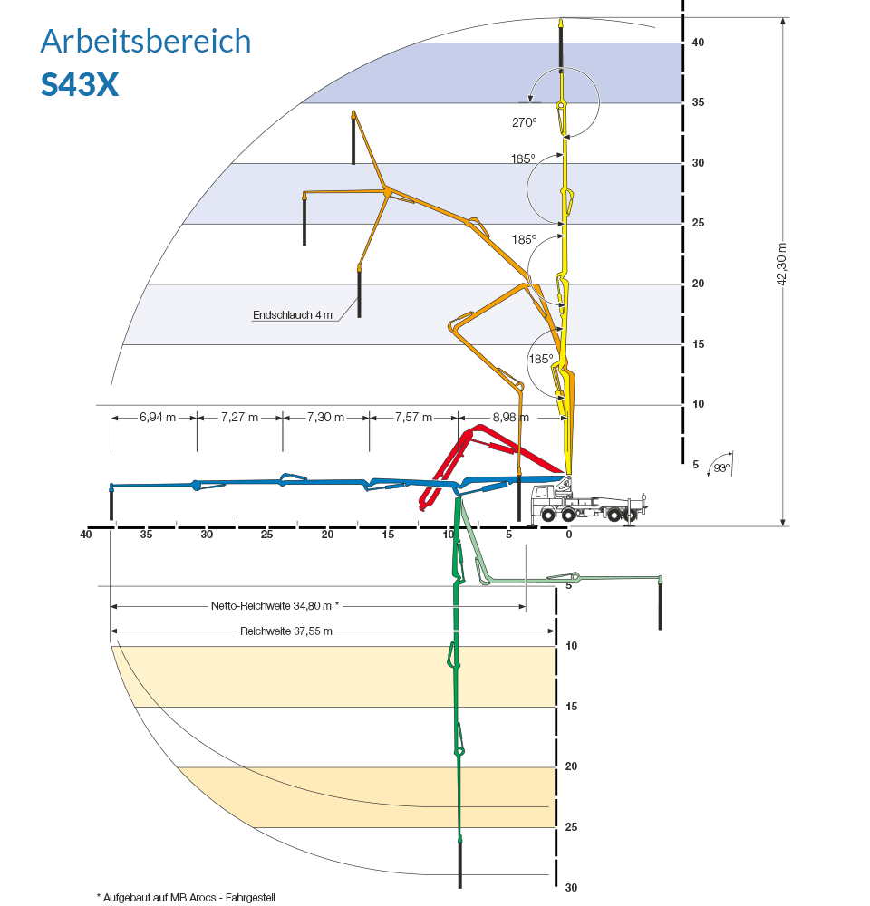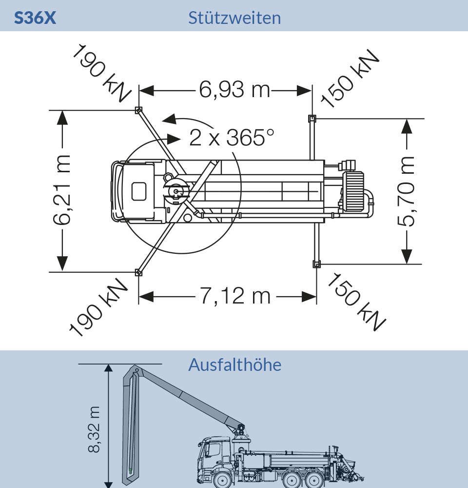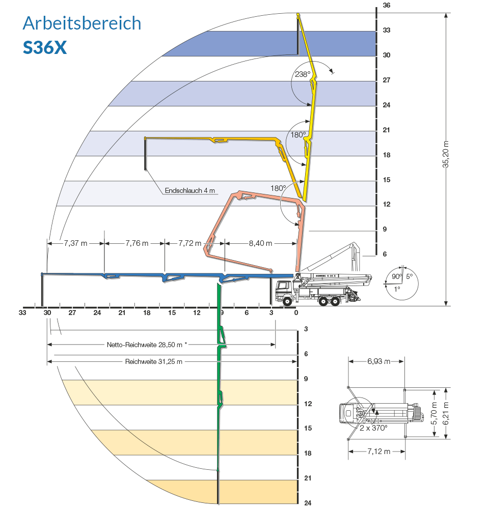 Die S36X besticht durch ihre vorteilhafte Kombination aus überraschender Wendigkeit durch kurzen Radabstand bei gleichzeitiger enormer Reichweite des Pumpenarms. Des Weiteren punktet die Maschine mit einer geringen Aufstellfläche.