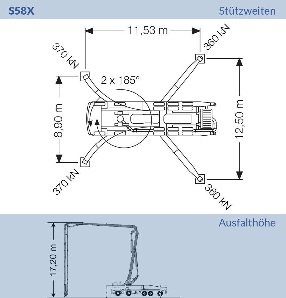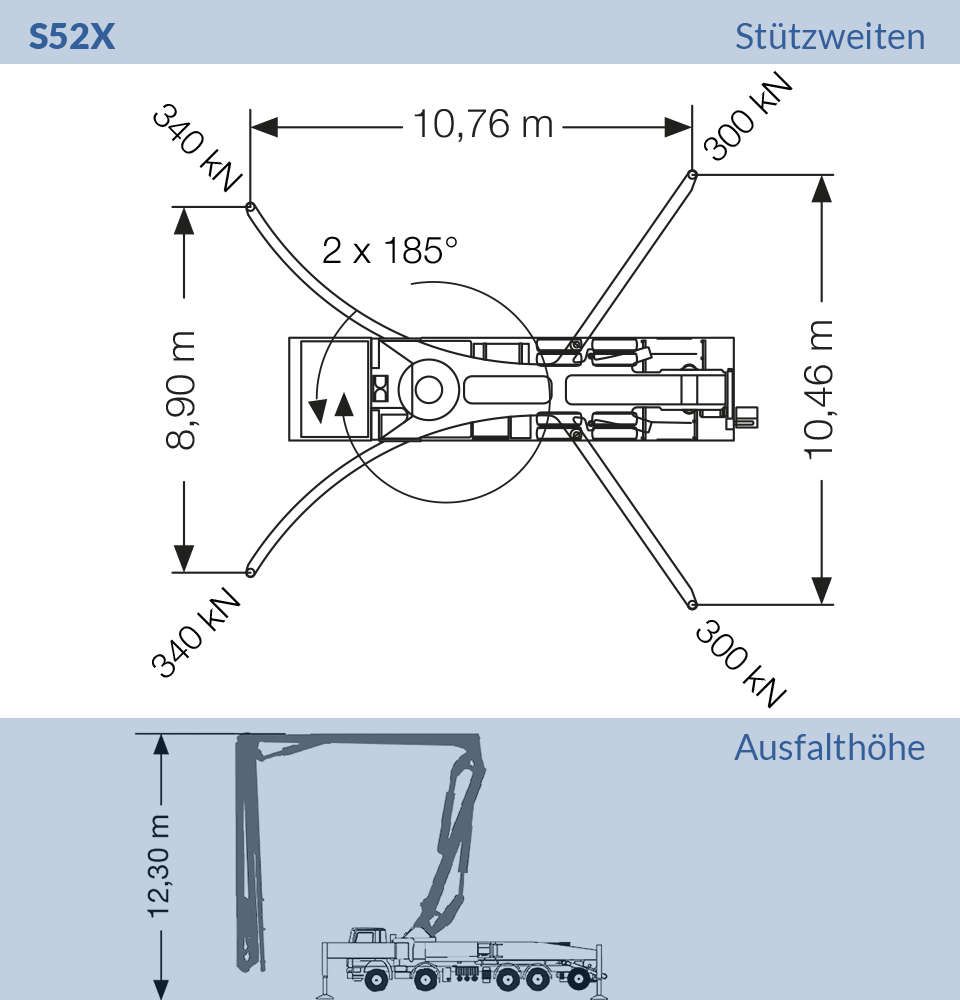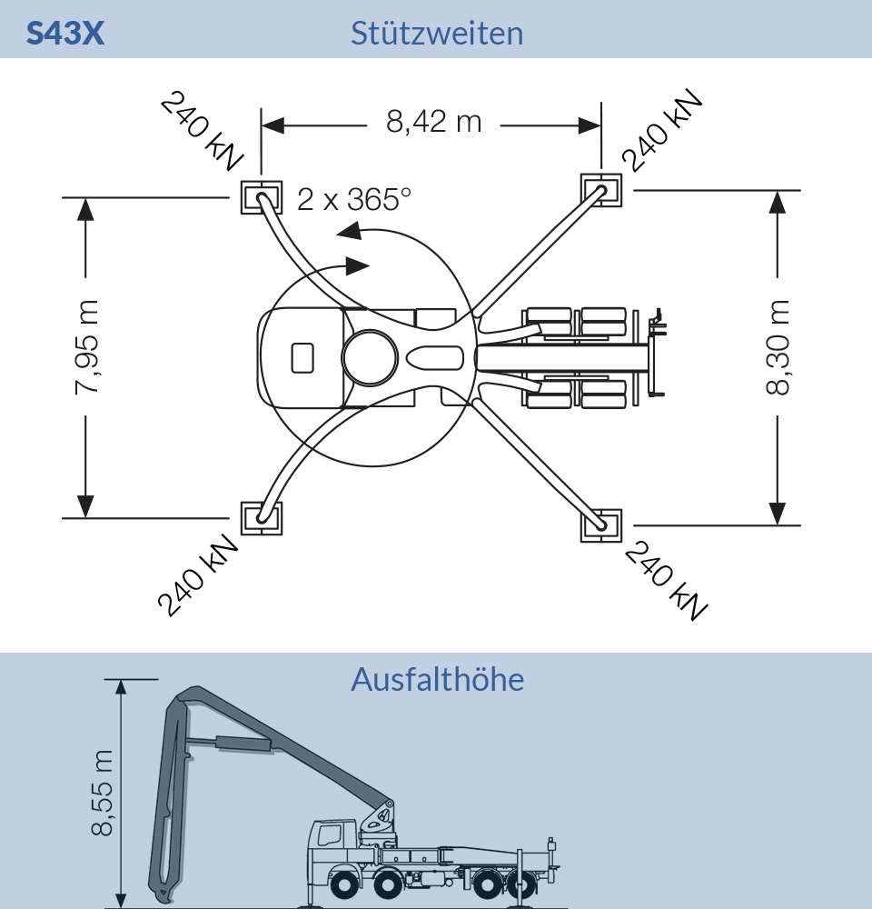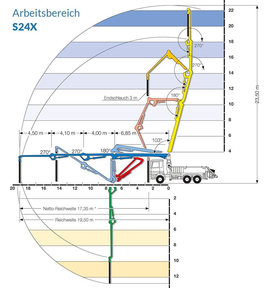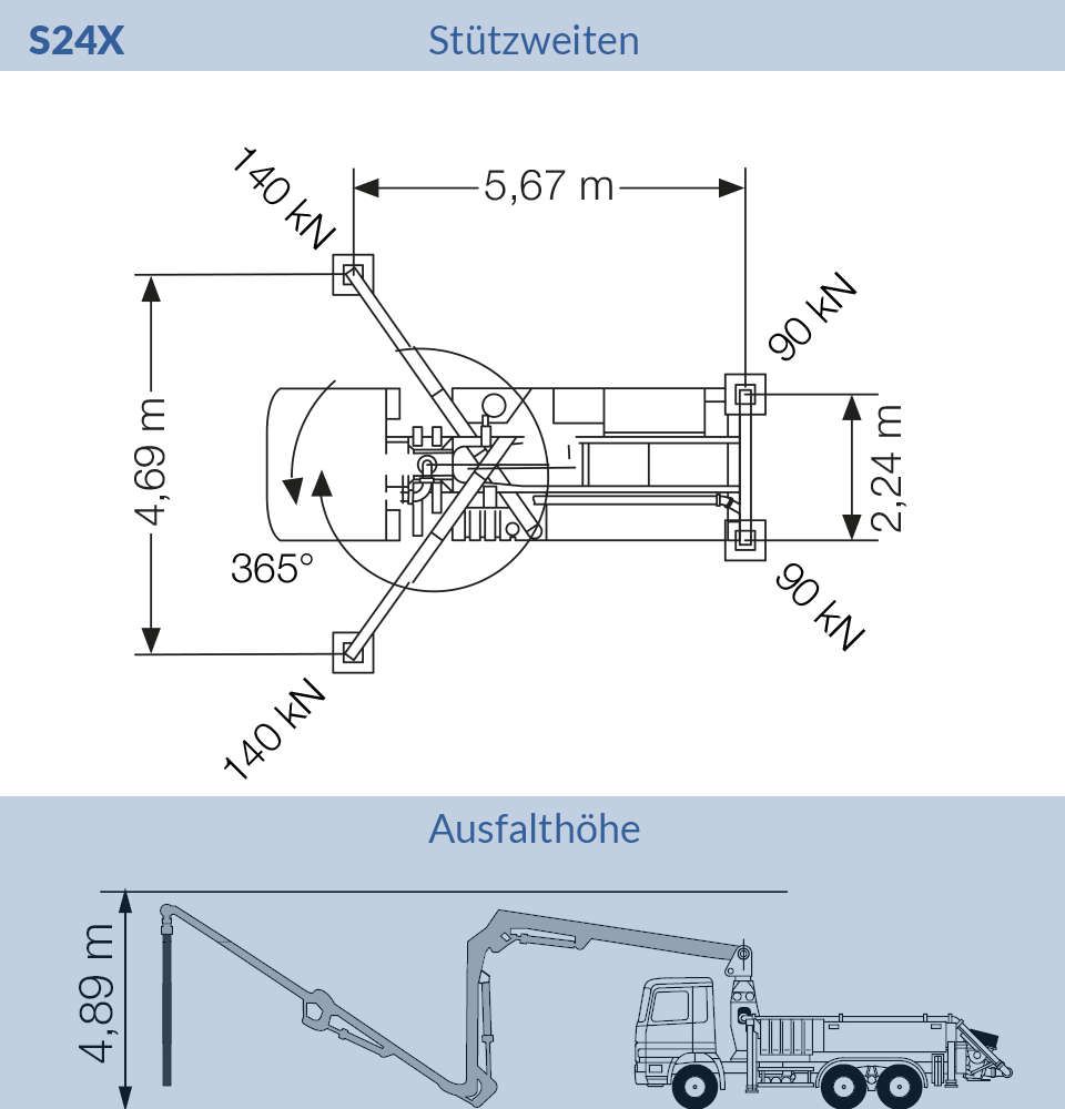 Die S36X besticht durch ihre vorteilhafte Kombination aus überraschender Wendigkeit durch kurzen Radabstand bei gleichzeitiger enormer Reichweite des Pumpenarms. Des Weiteren punktet die Maschine mit einer geringen Aufstellfläche.