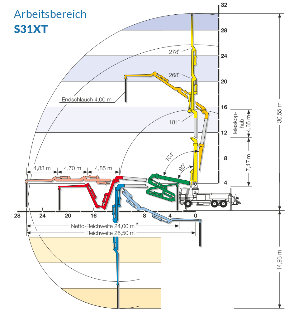 Die M31 wird auch Hallenmeister genannt. Dank seiner ausgeklügelten Kinematik, lässt sich der Mast während des Betoniervorgangs um eine Länge von 4,60 m teleskopieren. Trotz ihrer hallentauglichen Ausfalthöhe von unter 5,70 m erreicht die M31 dementsprechend Reichweiten und -höhen der 30-m-Klasse.